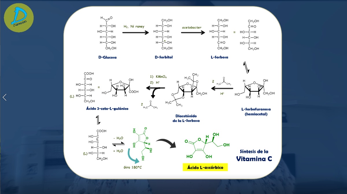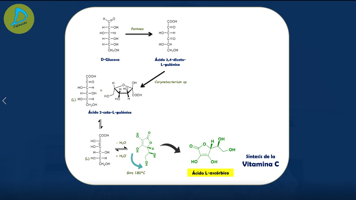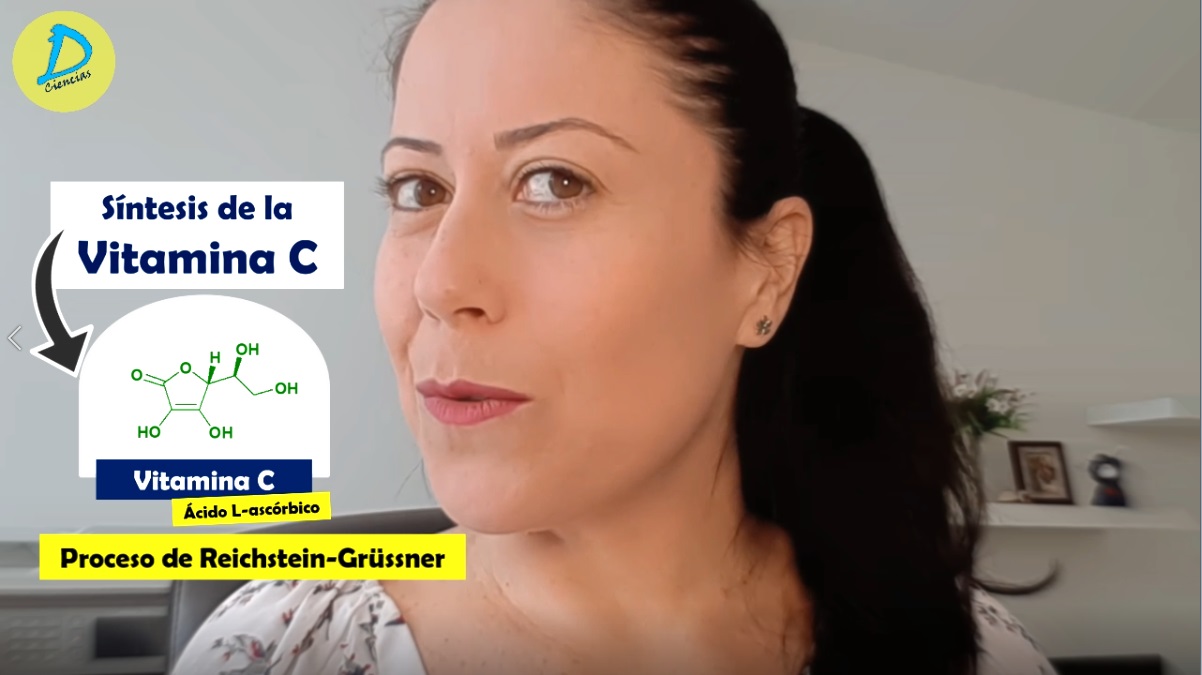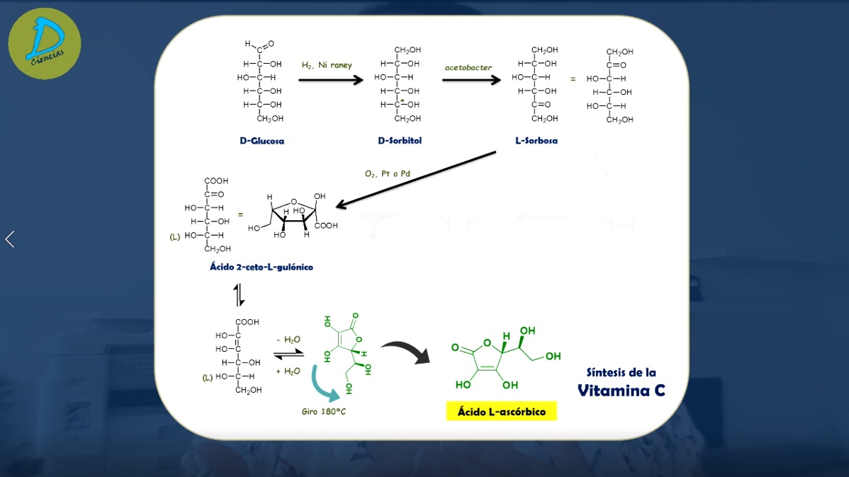 La vitamina C, conocida farmacéuticamente como ácido L-ascórbico y químicamente como (R)-3,4-dihidroxi-5-((S)-1,2-dihidroxietil)furano-2(5H)-ona, se sintetiza de manera industrial a partir de la D-glucosa,una molécula orgánica conocida por todos nosotros.