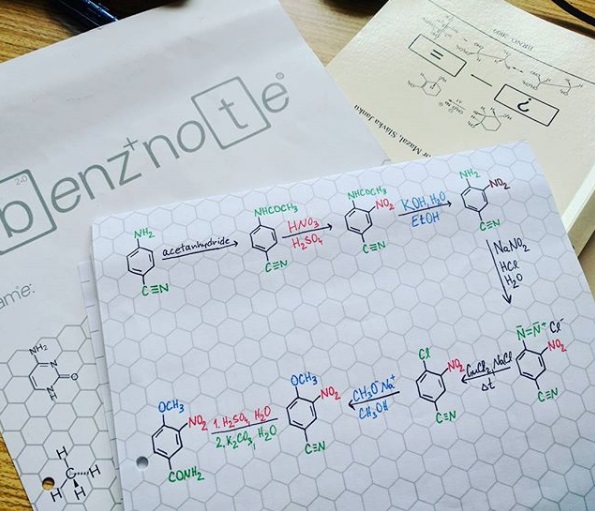 Gracias a unos cuadernos que tienen hojas con patrones hexagonales semitransparentes se puede dibujar las estructuras de las moléculas orgánicas de forma tan rápida y muy fácil.