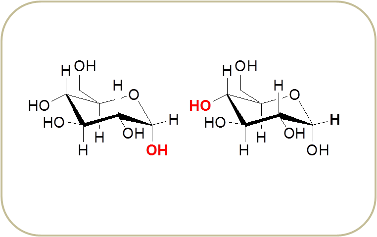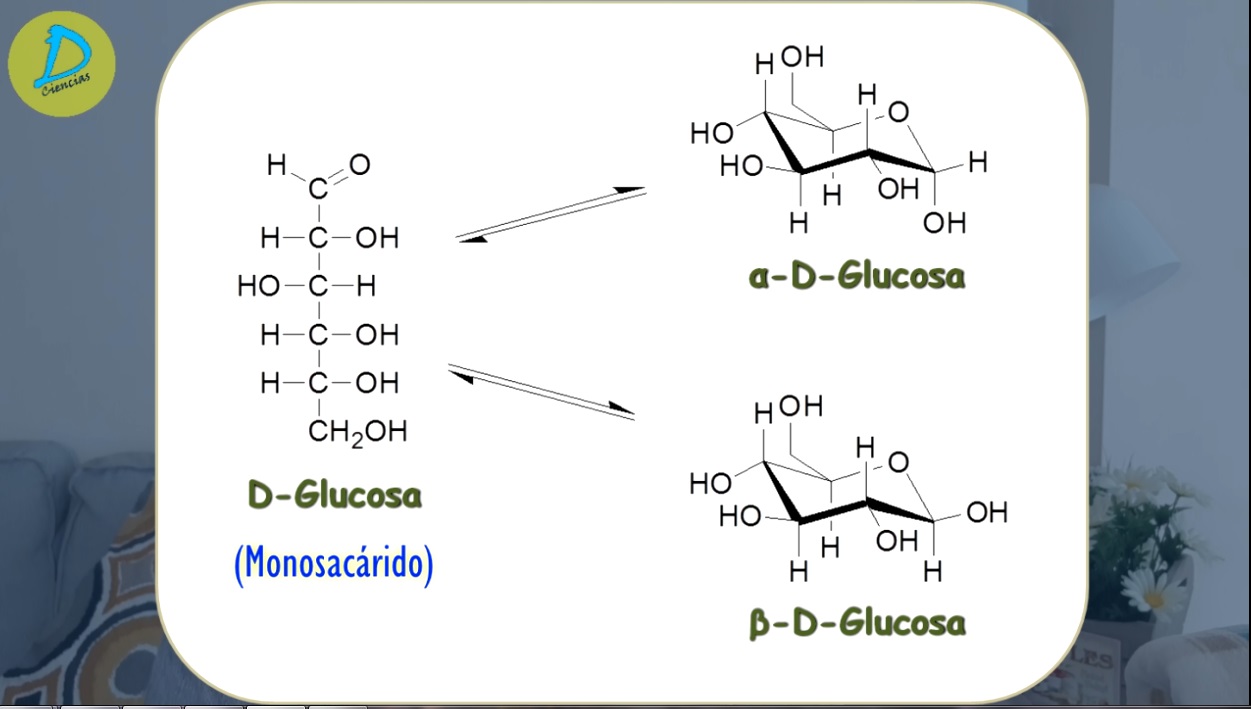 Dependiendo de cómo se pliegue en disolución la molécula de glucosa, formará la estructura α-glucosa y β-glucosa, la única diferencia entre ambas es la posición del grupo hidroxilo (-OH) en el carbono 1, por encima o por debajo del plano. Ambas estructuras están en equilibro, siendo un poco más estable la forma β.