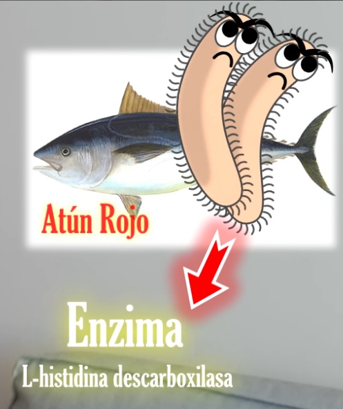 Hasta aquí todo claro, pero ¿qué hacen exactamente esas bacterias en la carne del pescado? Las bacterias presentes en la carne del pescado liberan un tipo enzima llamada enzima L-histidina descarboxilasa (Enzima específica para este aminoácido) la cual reacciona con L(+)-histidina, un aminoácido natural presente en grandes cantidades en la carne del pescado de la familia escómbridos, eso quiere decir, en la carne del atún, de la caballa y el bonito.