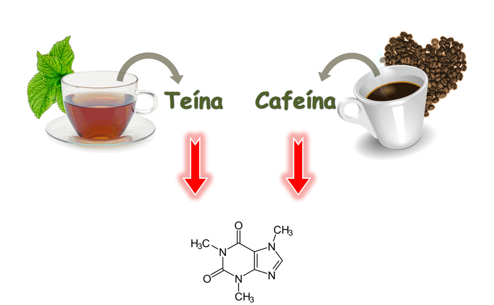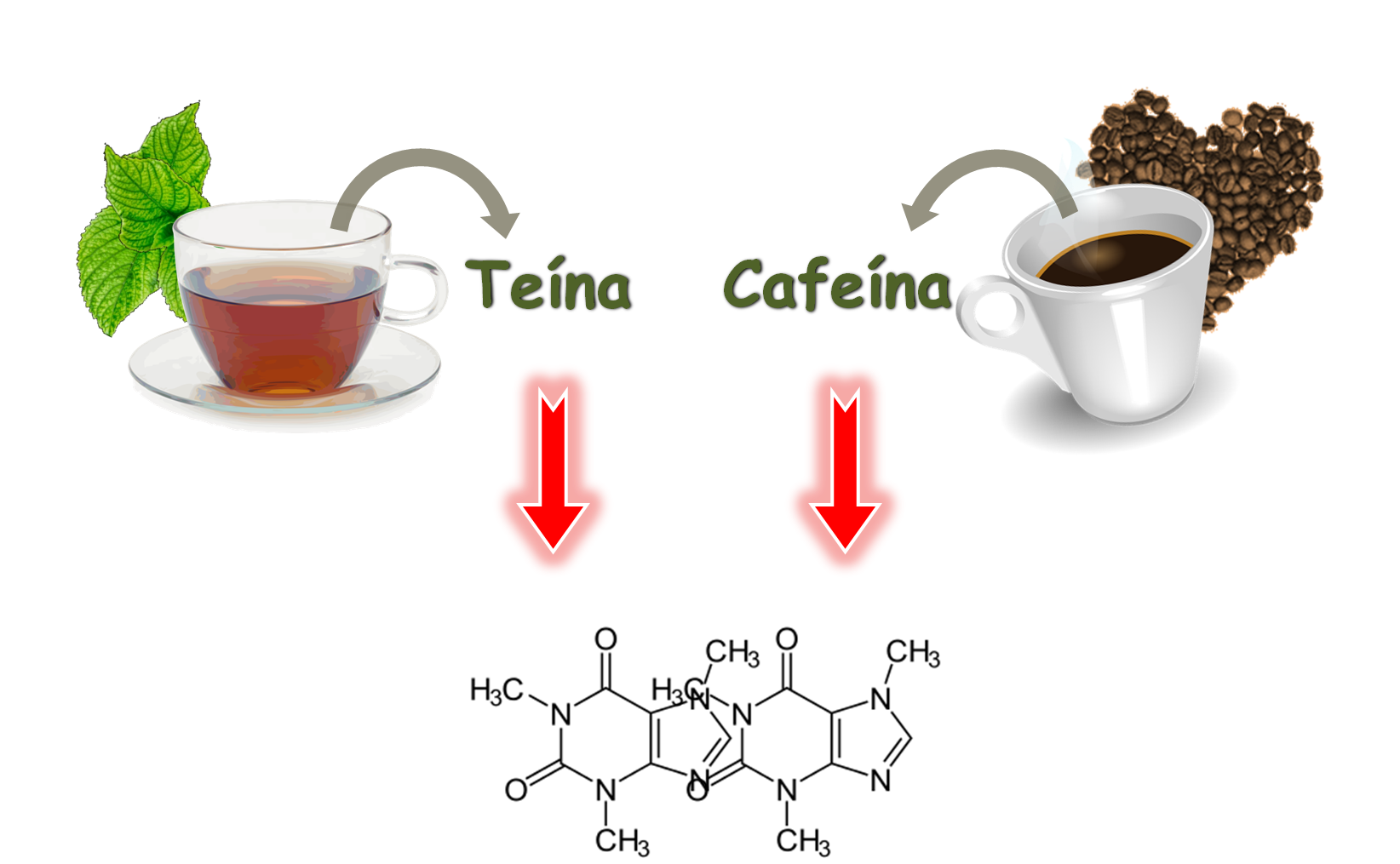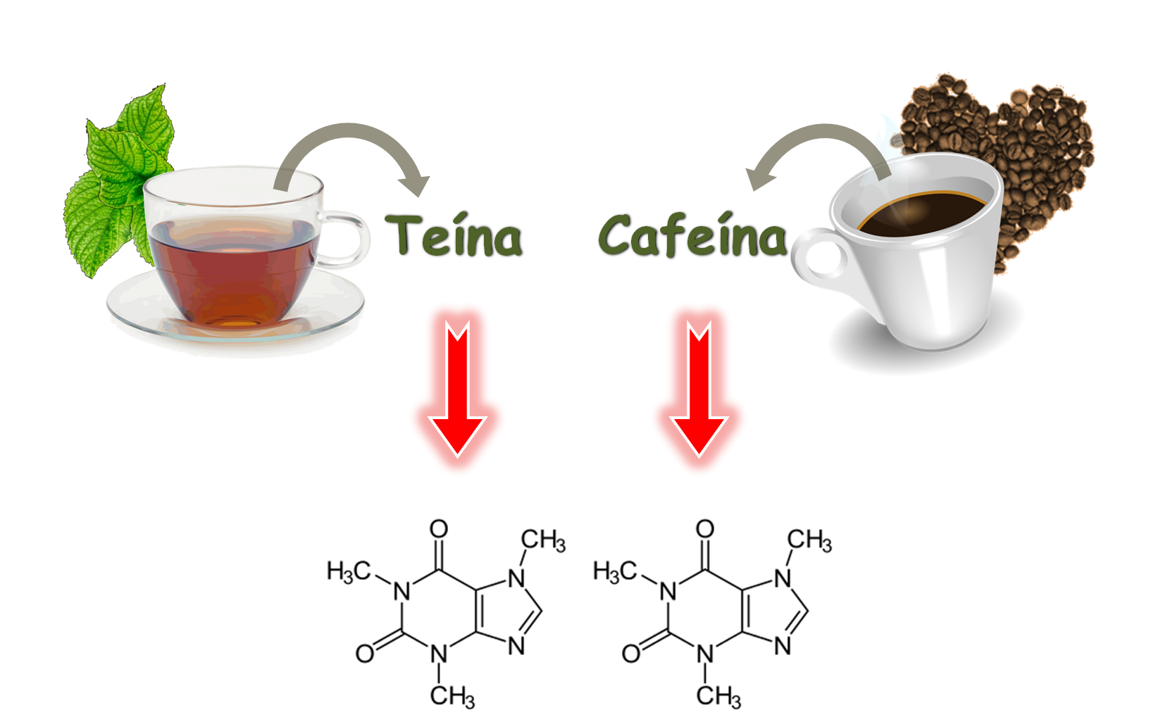 Observad detalladamente ambas estructuras. Como podéis ver, ambos compuestos orgánicos son iguales NO EXISTE DIFERENCIA entre la Teína y la Cafeína. Pero, ¿por qué se llaman diferente?