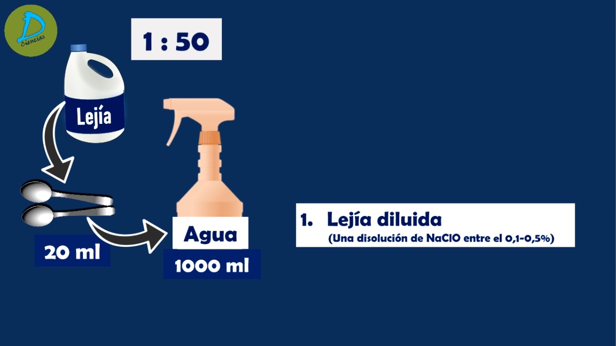1. Lejía diluida (Una disolución de hipoclorito sódico entre el 0,1-0,5%). Una de las formas más baratas para desinfectar superficies contra éste y muchos otros virus es utilizar lejía diluida, se pueden limpiar superficies sin necesidad de aclarar. Una forma sencilla de preparar una mezcla de lejía diluida, con una concentración que oscile entre 0,1-0,5, es utilizar una proporción de 1:50 (1 parte de lejía y 50 partes de agua). Por ejemplo, podemos utilizar un vaporizador de un litro lleno de agua (1000 ml), estoy hablando de los envases utilizados para los limpiacristales, y le añadimos dos cucharadas de lejía industrial (20 ml). Ojo, en nuestras casas lo que tenemos a nuestro alcance es lejía para uso doméstico con una densidad inferior a la lejía industrial (densidad de la lejía de uso doméstico=37 g/l; densidad de la lejía industrial superiores a 50g/l). En este caso utilizando EL DOBLE (40 ml de lejía doméstica), es decir, cuatro cucharadas de lejía por cada litro, se consigue una disolución superior al 0,1% y el poder desinfectante que estábamos buscando. Gracias al poder oxidante de la lejía se consigue destruir la envoltura del coronavirus.