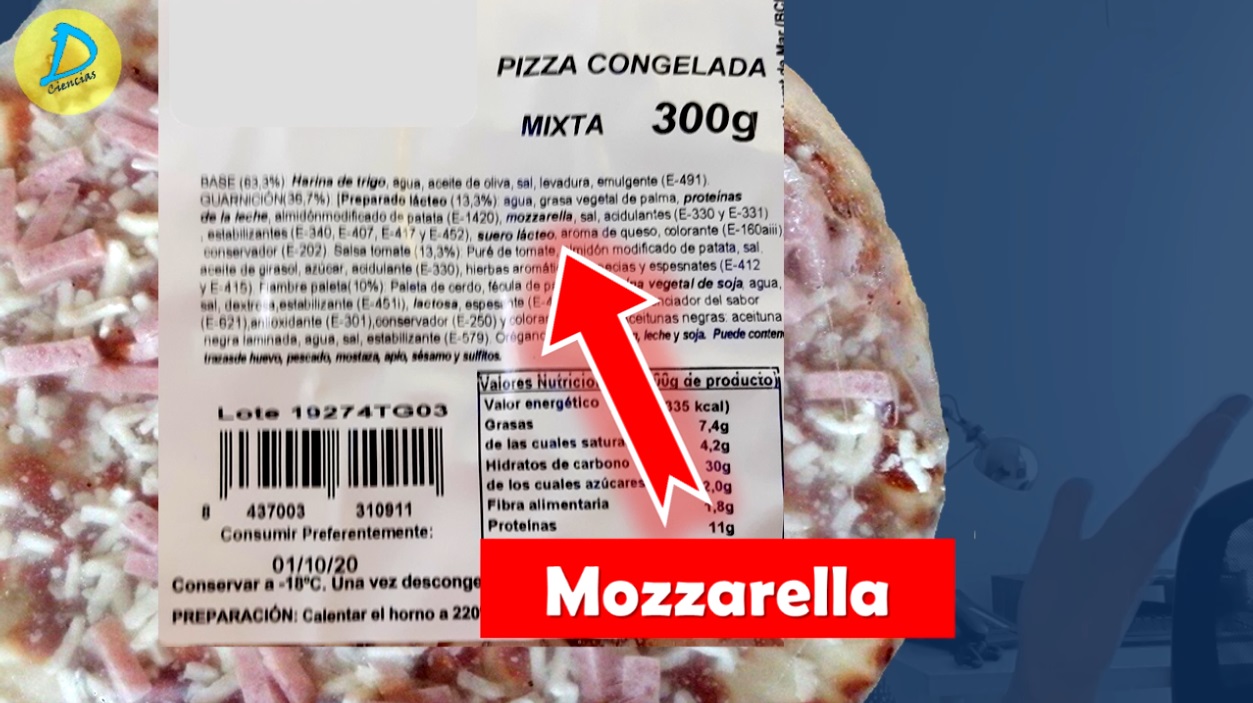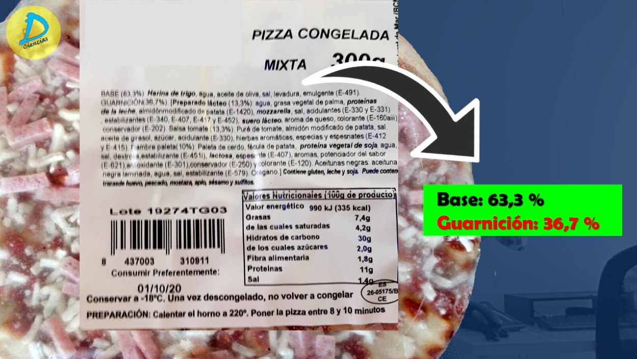 En el etiquetado de estas pizzas podemos obtener bastante información, en la lista de ingredientes es donde conseguiremos saber si el fabricante ha añadido queso o no. Si nos fijamos en detalle, observamos que el 36,7% de la pizza es la guarnición, la cual está elaborada a partir de un preparado graso, tomate y fiambre de paleta, vamos un falso jamón.