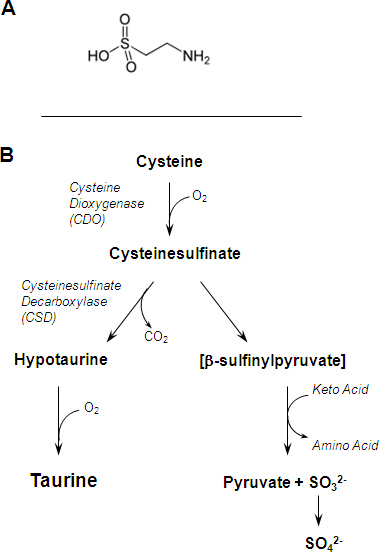 La ruta principal para la biosíntesis de taurina, que se muestra en la Figura 1B, es desde la metionina y la cisteína a través de la descarboxilasa del ácido cisteinesulfínico (CSD), y generalmente requiere la oxidación de la hipotaurina a la taurina como el paso final.