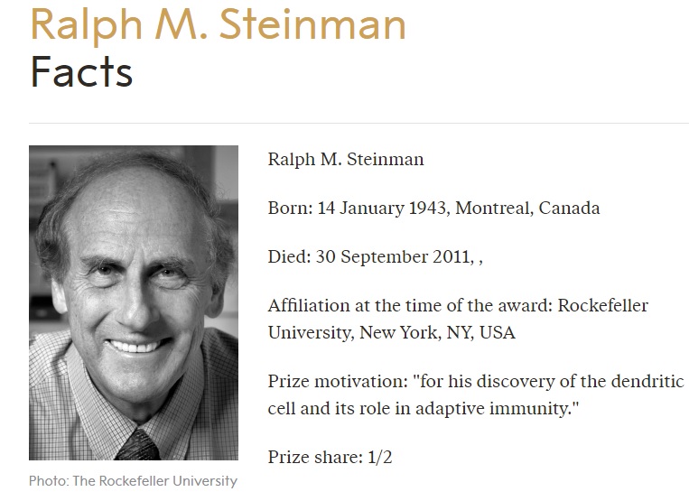 Ralph M. Steinman, The Nobel Prize in Physiology or Medicine 2011 https://www.nobelprize.org/prizes/medicine/2011/steinman/facts/